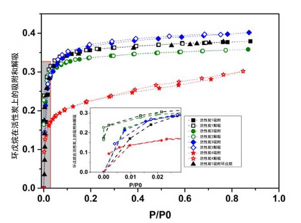 圖2:通過重量分析法測得的不同活性炭上環(huán)戊烷的吸附/解吸等溫線。