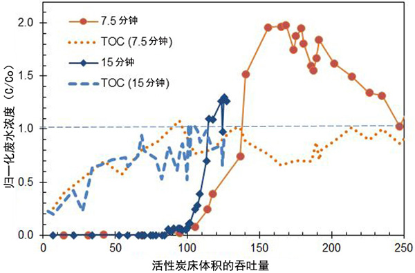 空床接觸時間對突破的影響說明如下:圖2用于123-三氯丙烷。盡管7.5分鐘和15分鐘EBCT的123-三氯丙烷突破的開始是相似的,但在100,000床體積之后,與7.5分鐘EBCT相比,15分鐘EBCT的突破更早。更長的EBCT容量降低可能是活性炭結(jié)垢的結(jié)果,這是由于更強的吸附力和不可置換的DOM到達吸附床的更深處,并超過了目標有機物的吸附位點和/或覆蓋了活性炭顆粒的孔而導致的。時間并防止進一步的目標有機物吸附。通過比較相似突破點的吞吐能力差異,說明了EBCT對其他cVOC的活性炭性能的影響,其中負值表示在15分鐘EBCT時容量更大,正值表示在7.5分鐘EBCT時容量更大(或在15分鐘EBCT時容量較小)。床體積數(shù)量達到突破的10%,50%或75%的平均容量差異(不包括VC,因為未評估15分鐘EBCT)分別為-0.1%,9%和13%,表明在運行時容量沒有損失。15分鐘的EBCT突破了10%,突破了適度的容量,因為更長的EBCT結(jié)垢了,因此突破了50%和75%。