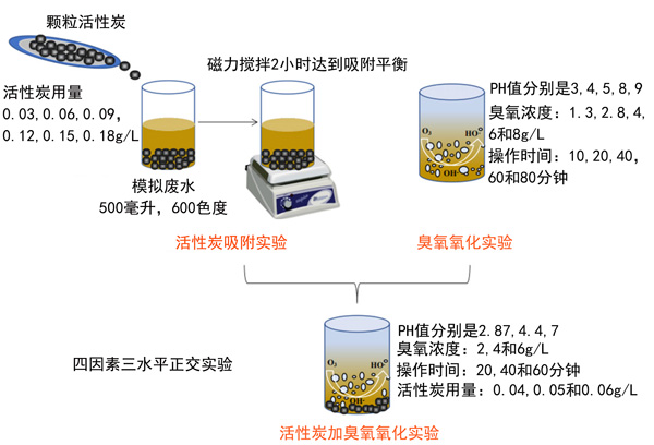 根據(jù)以前的單個活性炭吸附和臭氧化實驗的結(jié)果,設(shè)計了四個因素和三個水平的正交實驗,討論模擬廢水的色度和COD cr去除效果并確定最佳實驗參數(shù)。具有操作條件的實驗程序設(shè)計流程圖如圖2所示。