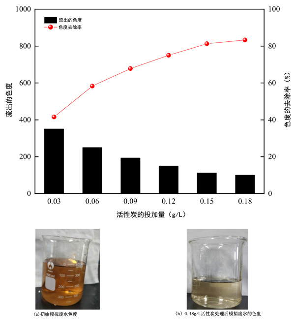 圖3:活性炭用量對模擬廢水中色度去除的影響,模擬廢水的色度。
