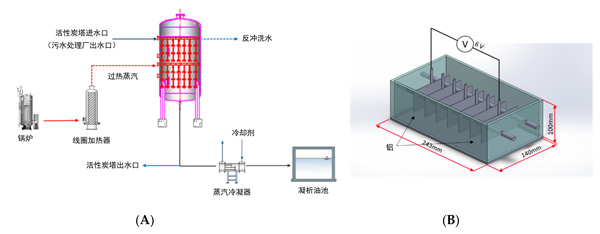 建造了一個用于微塑料去除實(shí)驗(yàn)的中試規(guī)模的設(shè)施,該設(shè)施由帶有熱再生系統(tǒng)的活性炭塔組成。該設(shè)備在接觸塔中運(yùn)行時的總質(zhì)量約為800千克活性炭。這個設(shè)施是由活性炭單元和過熱蒸汽單元組成的可熱再生裝置。該活性炭塔系統(tǒng)是在污水處理廠上建立的,收集污水樣本以進(jìn)行微塑料分析。如圖所示圖1A,蒸汽鍋爐中產(chǎn)生高于100℃的飽和蒸汽,并通過管線加熱器轉(zhuǎn)換為500-700°C的過熱蒸汽。蒸汽過熱進(jìn)行熱解過程,是由轉(zhuǎn)換后的過熱蒸汽通過塔內(nèi)的輻照管噴嘴在有效半徑內(nèi)噴灑到活性炭上,并提高了活性炭的溫度。通過噴灑500-700°C的過熱蒸汽來蒸發(fā)活性炭孔中的水分,并且通過無氧低溫將吸附的一氧化碳或二氧化碳和低分子量化合物與有機(jī)物和微塑料分解為水。此時,將未分解的未溶解的低分子量有機(jī)化合物與冷凝水混合,并返回到污水處理廠的進(jìn)水口。從活性炭再生裝置下部排出的蒸汽由熱交換器冷卻,然后引入冷凝水儲罐,并返回到污水處理廠進(jìn)水或進(jìn)行后處理。