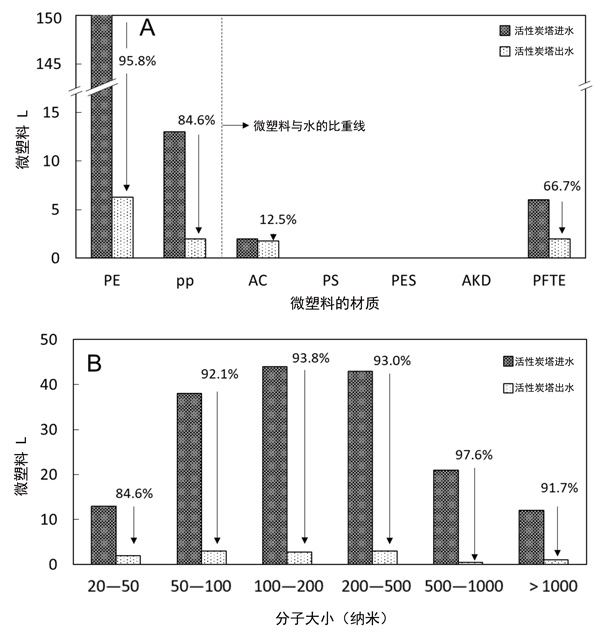 在污水處理廠的進(jìn)水和出水中觀察到未處理的污水樣品中觀察到七個不同的微塑料顆粒,包括聚乙烯(PE),聚丙烯(PP),丙烯酸酯(AC),聚苯乙烯(PS),聚酯(PES),醇酸樹脂(AKD)和聚四氟乙烯(PTFE)。PE是最豐富的MP材料類別,占MP顆?倲(shù)的72%,其次是PP(13%),AC(6%)和其他分?jǐn)?shù)相對較小的聚合物(1-4%)。假定樣品中微塑料材料類別的數(shù)量順序與原料的比重有關(guān)。具有較低比重的微塑料顆?梢酝ㄟ^從污水源沉降到污水處理廠的過程中,以較低的重力進(jìn)行更有效的輸送。在中試規(guī);钚蕴垦b置的進(jìn)水和出水中觀察到的MP顆粒的數(shù)量濃度和尺寸分布分別顯示在圖2AB中。通過活性炭處理,可以顯著提高微塑料的去除率(92.9%)。特別是,發(fā)現(xiàn)活性炭處理在去除比水輕的微塑料(例如PE和PP)以及所有尺寸范圍的微塑料(包括20–50µm尺寸)方面都是有利的,而初級和生物處理很少去除這些微塑料。關(guān)于微塑料去除效率,配備活性炭過濾系統(tǒng)的飲用水處理廠獲得了類似的結(jié)果(大約89%的去除率)。