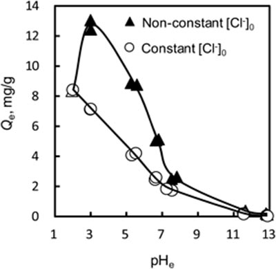 活性炭上的硝酸根離子吸附量與溶液的pH e之間的關(guān)系如圖1所示。硝酸根離子在堿性條件下幾乎不被吸附,這意味著氫氧根離子會抑制硝酸根離子的吸附。另一方面,隨著平衡pH的降低,硝酸根離子的吸附量增加。在堿性條件下,由于硝酸根離子與活性炭表面之間的靜電排斥,硝酸根離子很難被吸附在活性炭上。另一方面,硝酸根離子的吸附量在酸性條件下增加,這歸因于硝酸根離子與碳表面之間的靜電吸引力。然而,隨著平衡pH從3.0降低到2.0,觀察到硝酸根離子吸附的顯著降低。在此pH范圍內(nèi),氯離子的初始濃度從2 m增加到20 m M,這意味著共存的氯離子會抑制硝酸根離子的吸附。通過NaCl溶液將氯離子的初始濃度固定在20 m M時,可以清楚地發(fā)現(xiàn)氯離子對硝酸根離子的吸附抑制作用,表明硝酸根離子在所有pH區(qū)域的吸附量均低于沒有任何pH調(diào)節(jié)的溶液。因此共存陰離子會導(dǎo)致競爭吸附影響硝酸根離子吸附的效果,并且這種作用可能是較強(qiáng)的在共存陰離子的濃度較高。