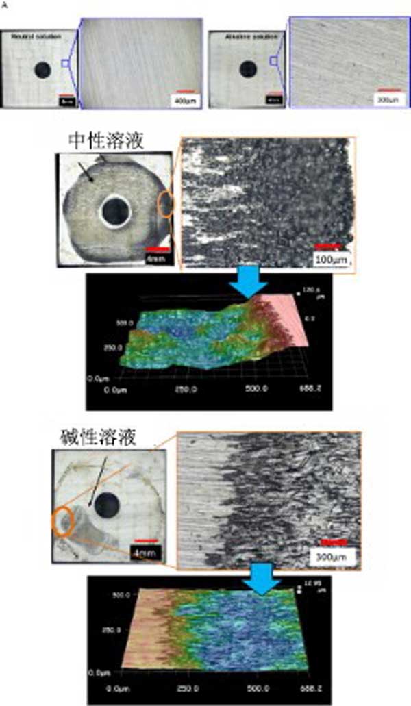 使用光學(xué)顯微鏡觀察實(shí)驗(yàn)后樣品的表面形態(tài),如圖3所示。在中性和堿性溶液中未與活性炭接觸的樣品中未觀察到縫隙腐蝕。另一方面,在中性和堿性測試溶液中與活性炭接觸的樣品上發(fā)生縫隙腐蝕。這些結(jié)果清楚地表明,當(dāng)樣品與活性炭接觸時(shí),縫隙腐蝕敏感性增加。在中性測試溶液的情況下,最大腐蝕深度為130μm并且縫隙腐蝕傳播以覆蓋樣品的幾乎所有褶皺區(qū)域。在堿性測試溶液的情況下,最大腐蝕深度為25μm并且腐蝕區(qū)域遠(yuǎn)小于中性溶液的情況。這些結(jié)果表明,在中性溶液的情況下腐蝕區(qū)域和深度更大,這表明在吸附塔中發(fā)生實(shí)際腐蝕。在堿性溶液的情況下腐蝕面積和深度較小的原因被認(rèn)為是Fe(OH)2的溶解速率的事實(shí)堿性溶液減少,這導(dǎo)致腐蝕速率降低;旧,在陽極部位的pH降低至去鈍化pH是縫隙腐蝕開始和傳播所必需的?紤]到這個(gè)方面,還可以解釋縫隙腐蝕行為的差異。